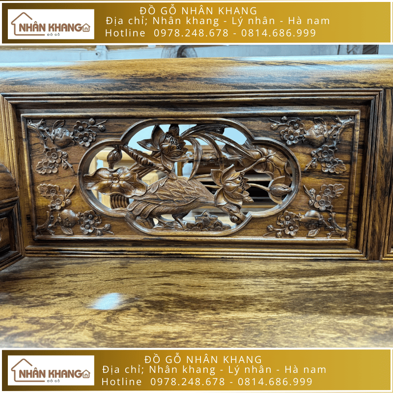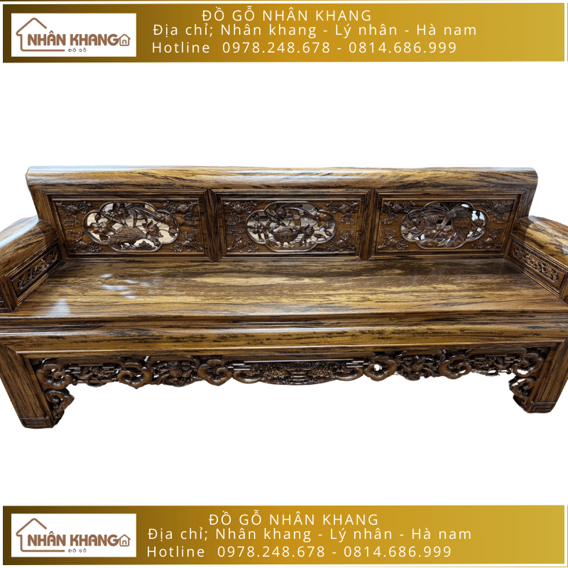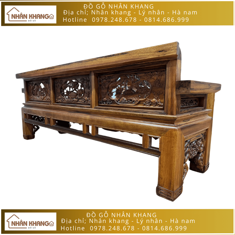 Bộ trường kỷ có màu sắc của gỗ tự nhiên rất đẹp mắt và độc đáo. Bề mặt sản phẩm được chạm khắc thêm nhiều chi tiết truyền thống khác nhau như: hoa sen, chim chóc, cây mai,... các chi tiết đều được thực hiện tỉ mỉ bởi đội ngũ nghệ nhân lành nghề của Nhân Khang với nhiều năm kinh nghiệm.