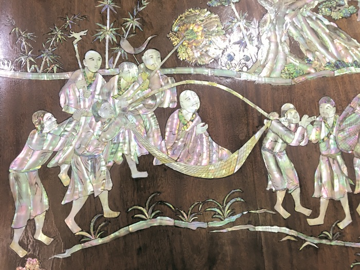 Tranh khảm trai và họa tiết in trên bình gốm miêu tả tích đức Trần Anh Tông ra đón vua cha về kinh