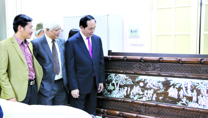 Chủ tịch nước Trần Đại Quang thăm cơ sở sản xuất bức tranh khảm trai “Trúc Lâm Đại sĩ xuất sơn đồ” Ảnh: Nguyễn Đình Toán