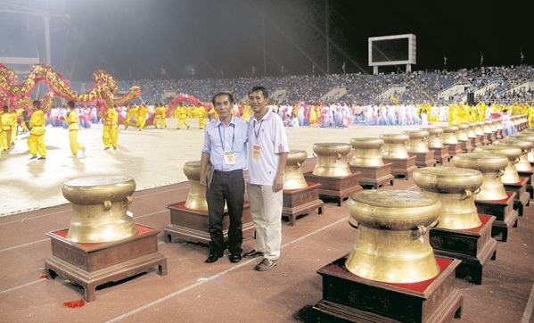 Hai nghệ nhân Thanh Hóa bên dãy trống đồng dịp Đại lễ 1000 năm Thăng Long